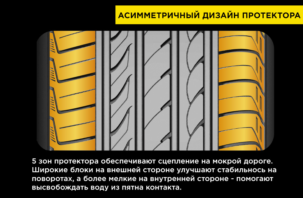 Протектор разделен на пять функциональных зон для улучшения сцепление на сухой дороге и динамики на мокрых покрытиях. Большое количество глубоких дренажных дорожек и более мелких извилистых ламелей плечевой зоны способствуют отводу воды из области контакта протектора с дорогой. Реализуемая таким образом функция самоочистки надёжно защищает от эффекта аквапланирования, благодаря чему поездки в дождливую погоду становятся безопасными.