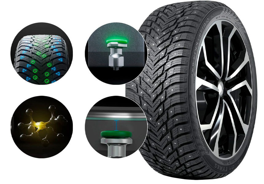 Двойная ошиповка Nokian Tyres Hakkapeliitta 10 EV SilentDrive позволяет обеспечить надежное сцепление на скользком дорожном покрытии. Ошиповка данных шин проходит на заводе. Используются шипы двух видов. Шипы, расположенные в беговой дорожке покрышки, обеспечивают надежное сцепление при наборе скорости и торможении. Шипы в виде звездочки, расположенные в боковой части, гарантируют высокий коэффициент сцепления при маневрировании и перестроении.