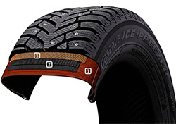 Зимняя шина Observe Ice-Freezer имеет направленный рисунок протектора, оптимизированный для лучшего сцепления и курсовой устойчивости как в продольном, так и в поперечном направлении. Высокоамплитудные 3D-ламели обеспечивают уверенное маневрирование на зимней дороге, а специальные выступы Snow Blade в плечевой зоне повышают проходимость в глубоком снегу и колее.